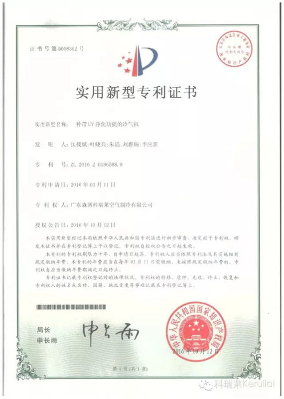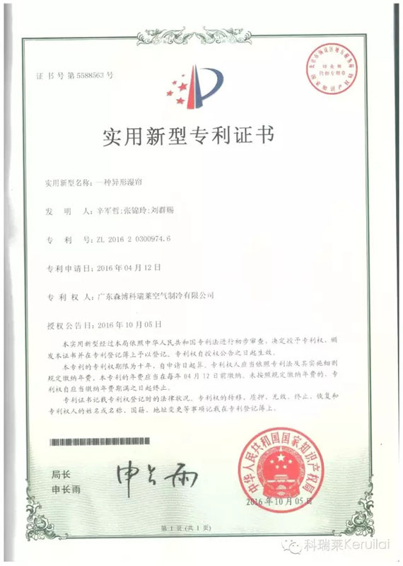 科瑞莱公司依托母公司森博集团,获得国际领先技术与雄厚资金支持,结合市场需求,经过科瑞莱高级工程师们的不断努力,于2016年10月又喜获4项国家专利,分别是:一种异形湿帘、一种带UV净化功能的冷气机、一种带净化功能的冷气机、一种带颗粒物净化清洗功能的冷气机。